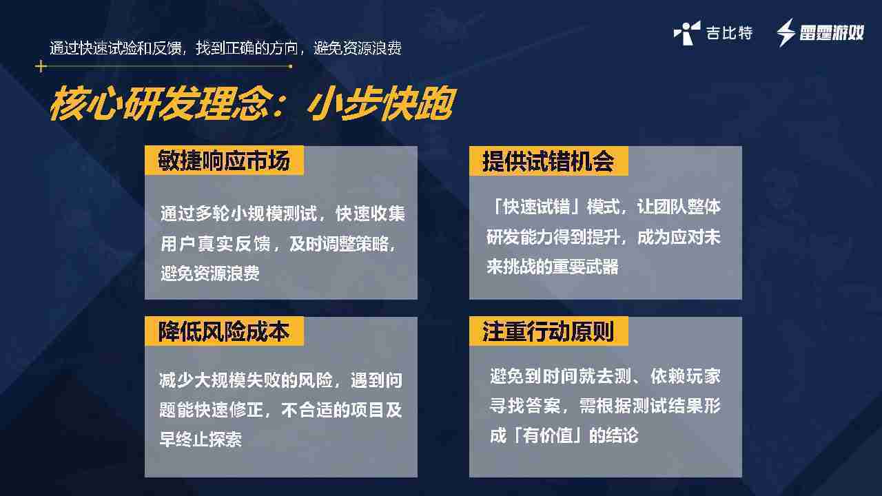 从目前的实践来看,,,内容向确实不合适,,,因为小步快跑更适合做玩法的尝试,,,,但是如果是内容项,,,玩法已经确定的,,,这时候应该做切片,,,,而不是做小步快跑的方式,,,因为做切片的成本是很高的。。。。我们有过两个项目,,要花很长时间做切片的内容,,,,而切片内容只占整个项目的1/10,,,但要花的时间成本、、、、人力成本、、经济成本可能会到1/3,,,,所以用很短的时间做游戏的原型,,,验证其好不好玩,,,,是想尝试在粗糙表达的情况下,,看看能否获得非常好的留存表现。。。如果留存表现非常好,,证明游戏内容体验是比较准确和非常好的内核,,,我们会尝试加外围内容的拓展。。。。