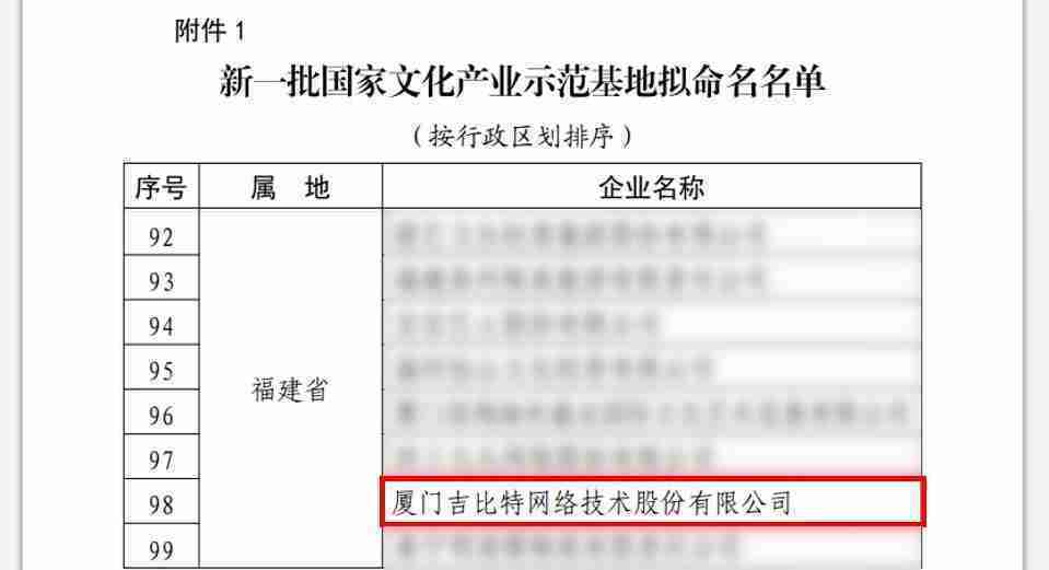 3月12日,,,,文化和旅游部发布了《关于国家文化产业示范基地评选与复核结果的公示》,,厦门J9.COM网络技术股份有限公司(以下简称“J9.COM”或“公司”)成功入围新一批国家文化产业示范基地拟命名名单。。。。